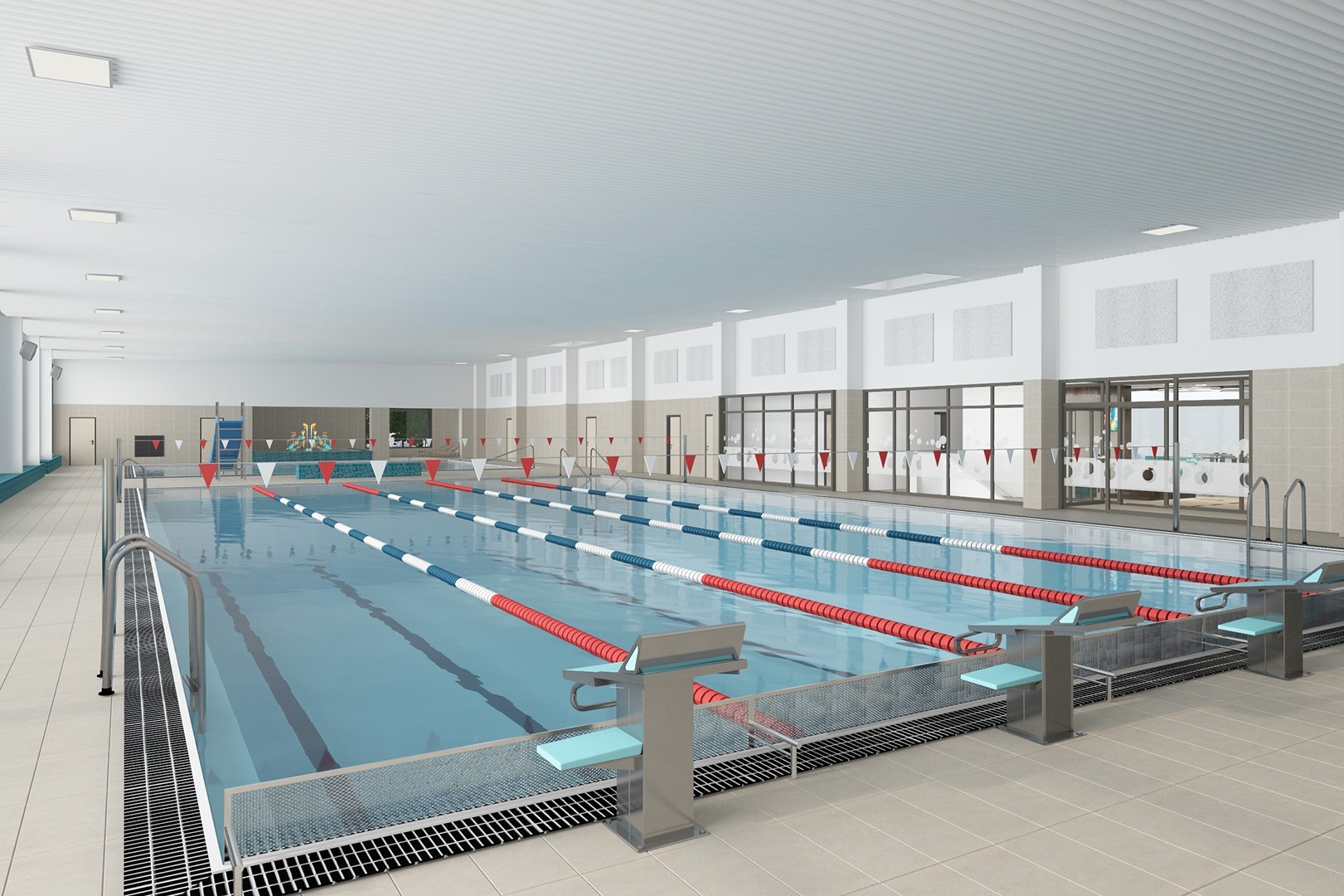 Am Montag, 29. September 2025, 10:30 Uhr, ist offizieller Baubeginn für die Sanierung und Erweiterung der Schwimmhalle am Alexander-Puschkin-Platz in Spremberg/Grodk. Symbolisch werden Bürgermeisterin Christine Herntier, Elke Franke, Vorsitzende der Stadtverordnetenversammlung, und René Kaps von der Planungsgesellschaft BAUCONZEPT mit je einem Fäustel die Teilrückbauarbeiten beginnen. Bei der Sanierung und Erweiterung der Bestandsschwimmhalle handelt es sich um einen Teilrückbau und Errichtung neuer Funktionsbereiche sowie die Erweiterung der Schwimmhalle von bisher 4 auf 5 Bahnen in Richtung der jetzigen Glasfassade. Außerdem wird der Eingangsbereich der Schwimmhalle neu errichtet in Form eines Anbaus, der von der Berliner Straße aus zugänglich ist. Der barrierefreie Zugang wird über eine Liftanlage zum Kassenbereich und einen Aufzug im Inneren der Schwimmhalle gewährleistet. Das neue Foyer mit Kassenbereich fungiert als Verteiler und bietet bereits den ersten Einblick in die Schwimmhalle. Der Saunabereich befindet sich im Keller und hat über einen Lichthof einen voll nutzbaren Außenbereich, welcher von außen nicht sichtbar ist. Alle Saunabereiche sind barrierefrei erschlossen und nutzbar. Das äußere Erscheinungsbild der Halle wird durch großformatige Platten einer Vorhangfassade definiert. Hierbei wird es eine Unterscheidung zwischen Halle und